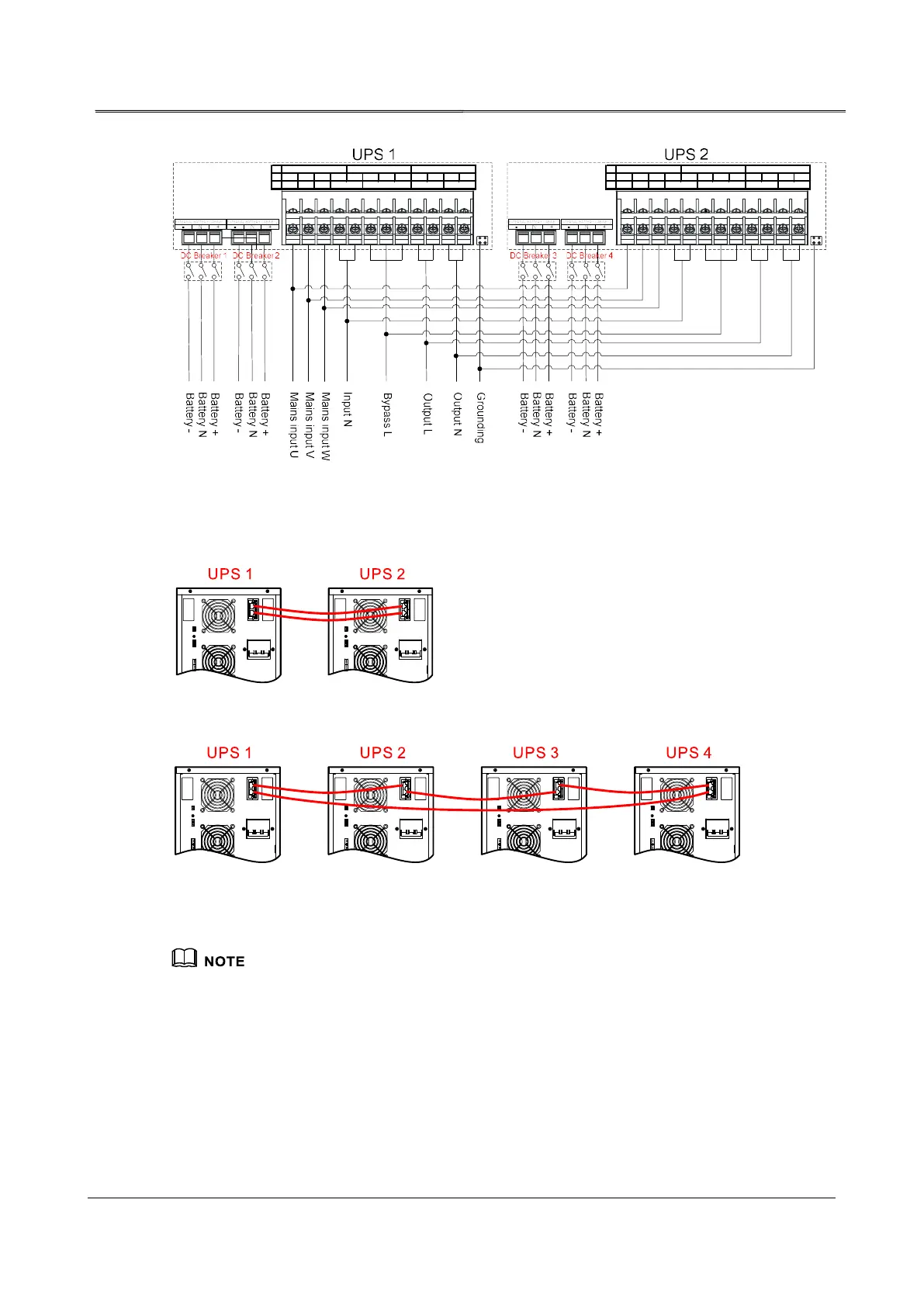 When the battery pack is shared by UPS in the parallel system, please make sure that all battery