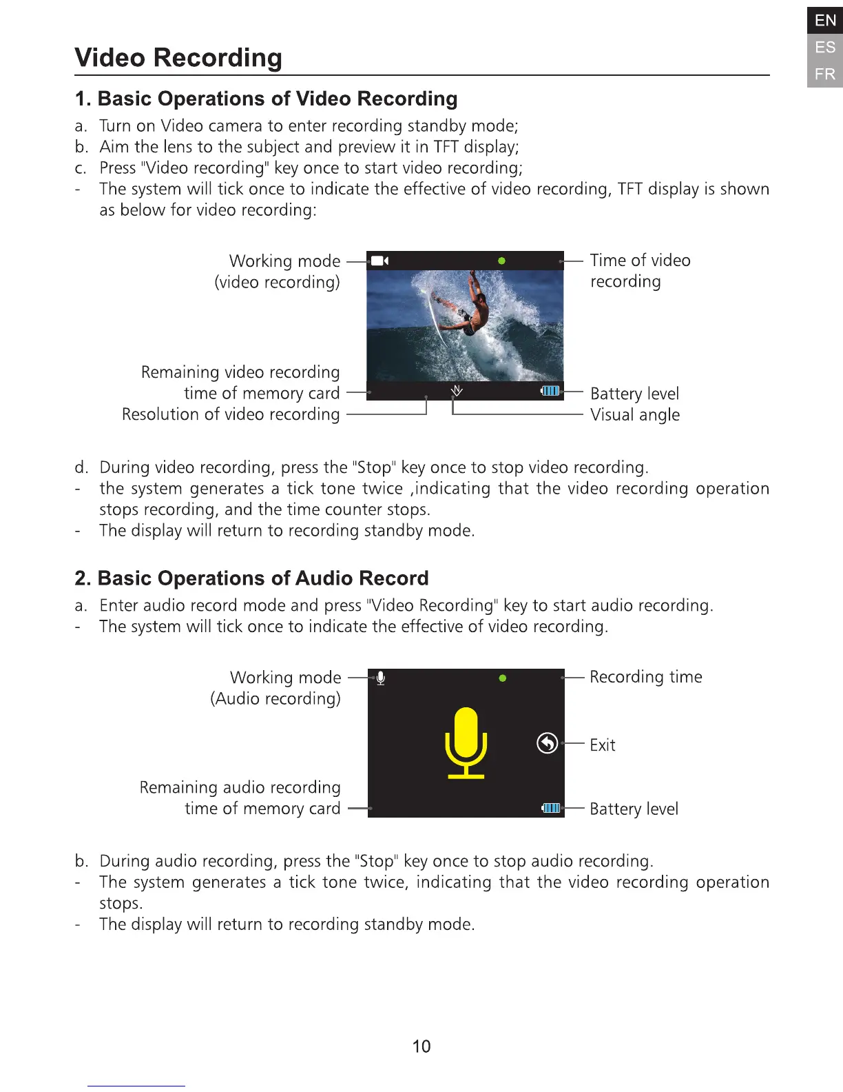 AEE S71T Plus - Video Recording; Basic Operations of Video Recording; Basic Operations of Audio Record
