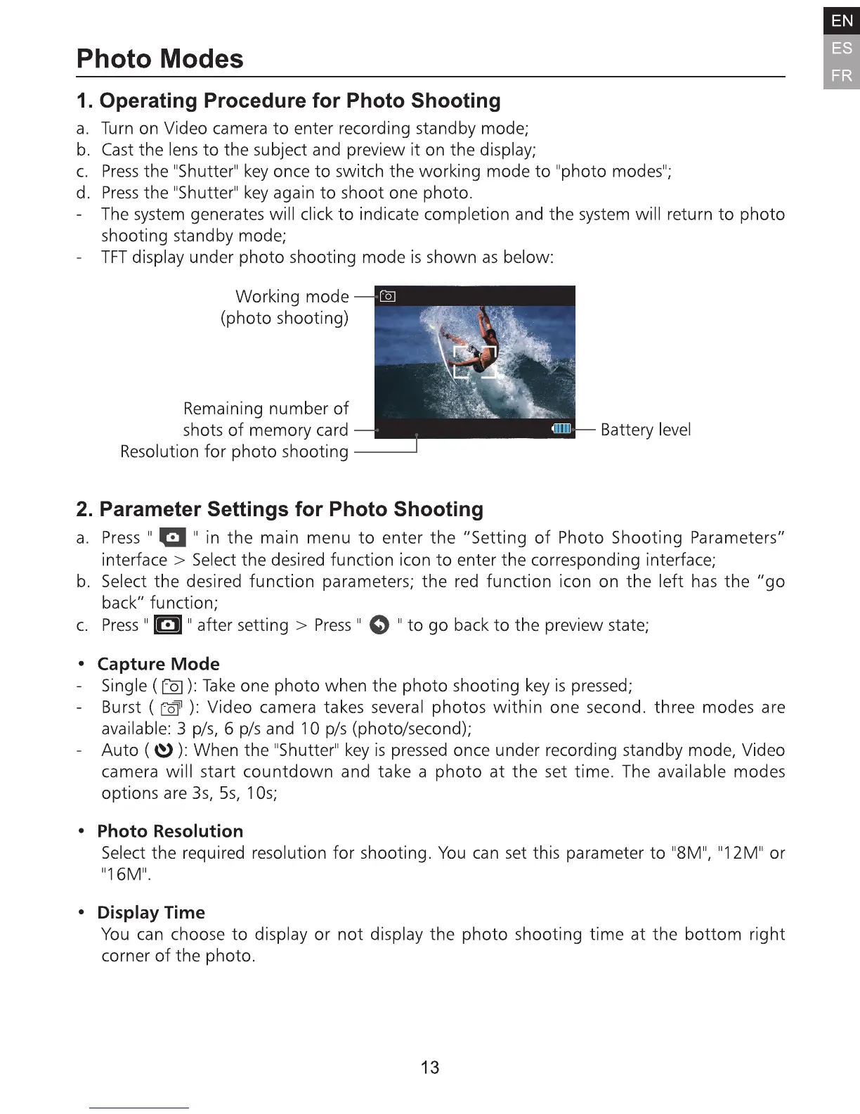 AEE S71T Plus - Photo Modes; Operating Procedure for Photo Shooting; Parameter Settings for Photo Shooting