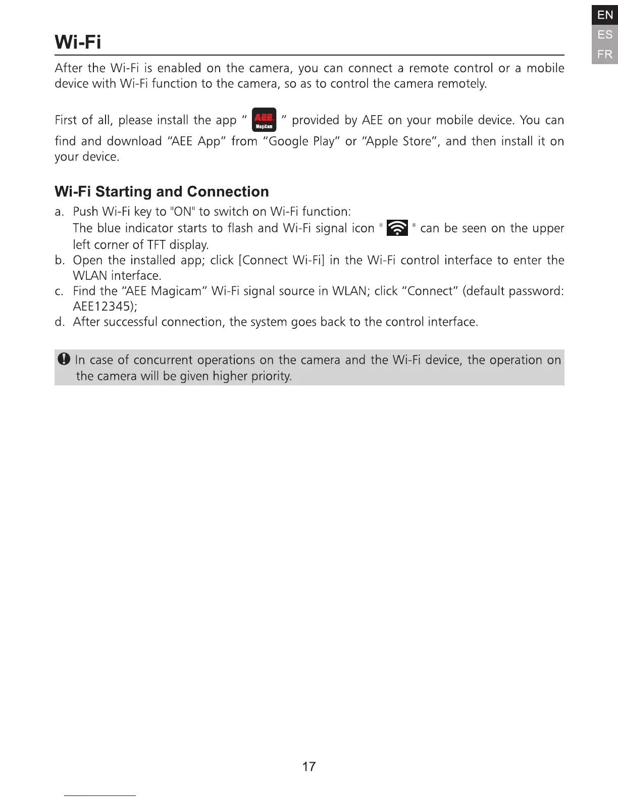 AEE S71T Plus - Wi-Fi; Wi-Fi Starting and Connection