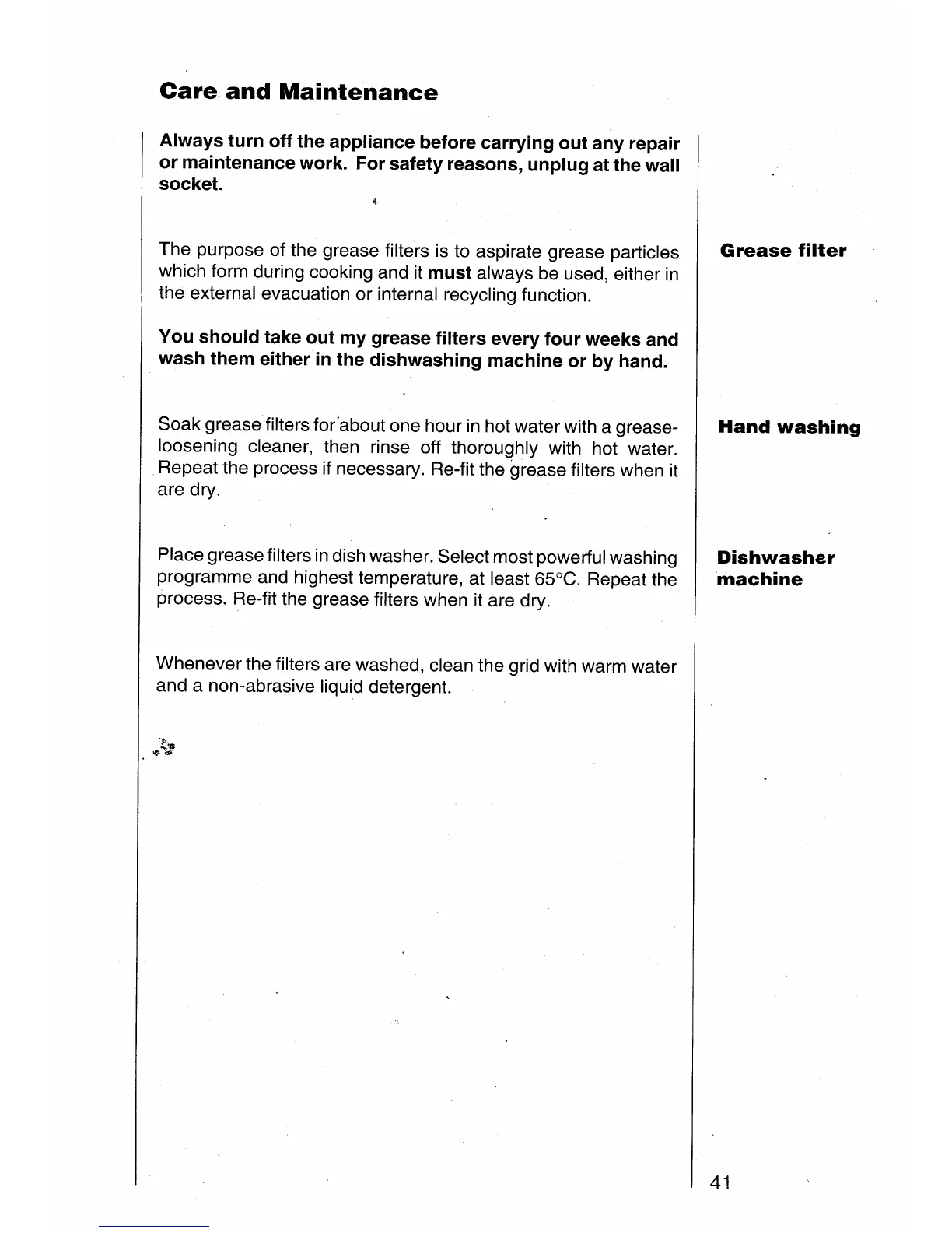 AEG 511 D - Care and Maintenance; Grease Filter; Hand Washing; Dishwasher Machine