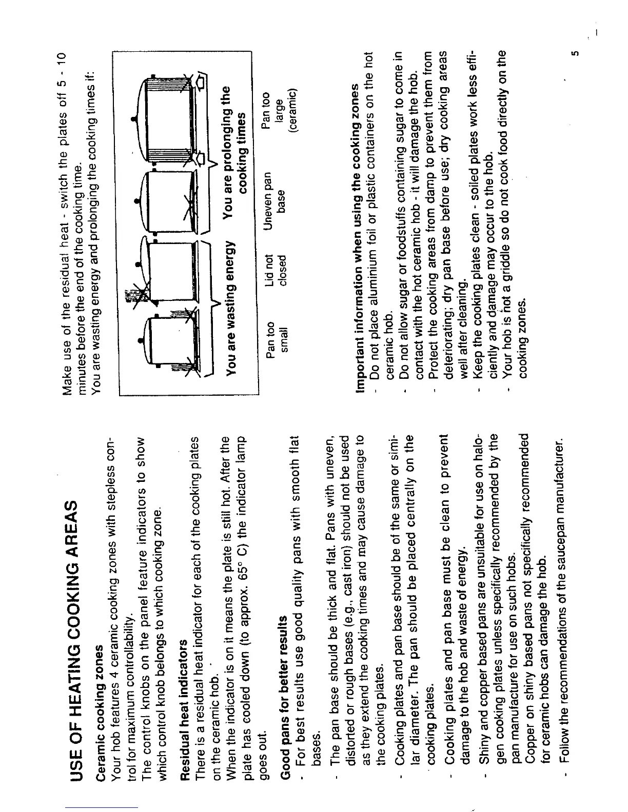 AEG 6299 K - Use of Heating Cooking Areas; Residual heat indicators; Good pans for better results; Important information when using the cooking zones
