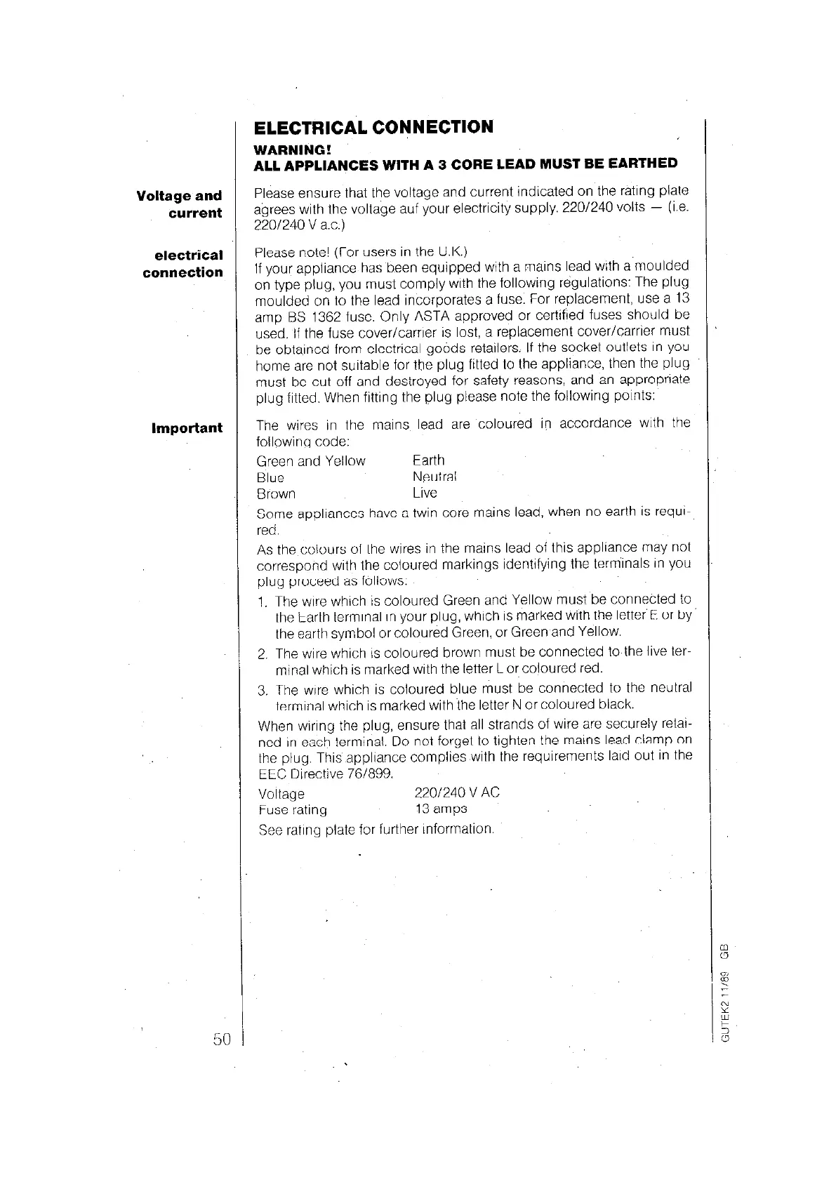 AEG 710 D - Electrical Connection and Safety; Voltage and Current Compatibility; Wiring and Plug Safety (UK); Wire Color Identification