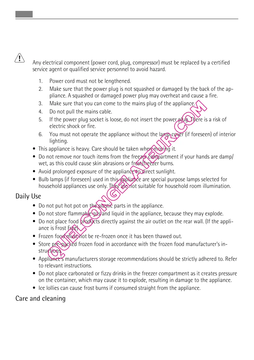Any electrical component (power cord, plug, compressor) must be replaced by a certified