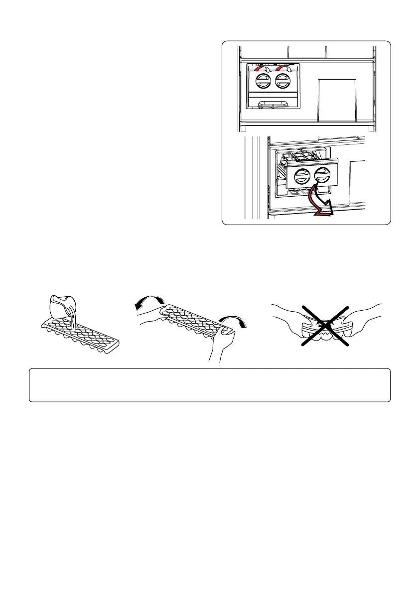 • Die Eiswürfel lösen sich aus der Schale durch Verwinden oder wenn die Eisschale kurze