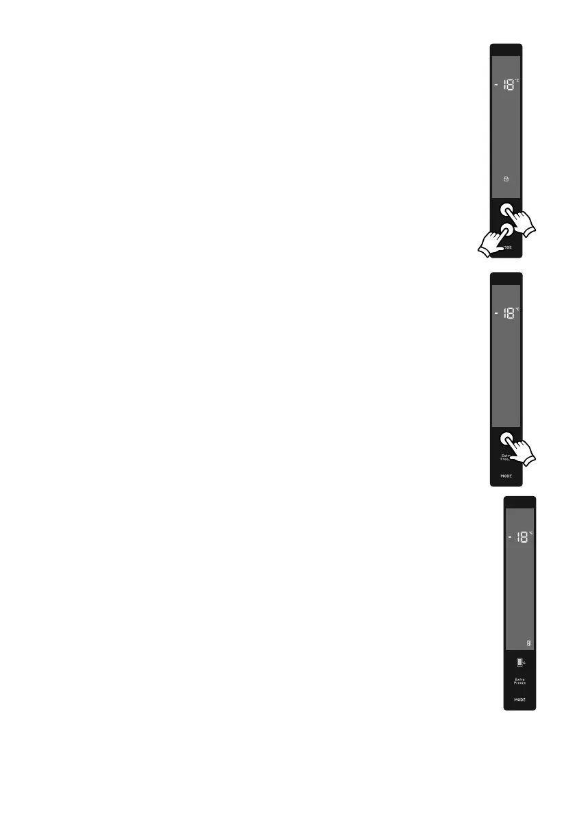 • Tryck och håll in super "Extra" - och frystemperaturinställningsknapparna