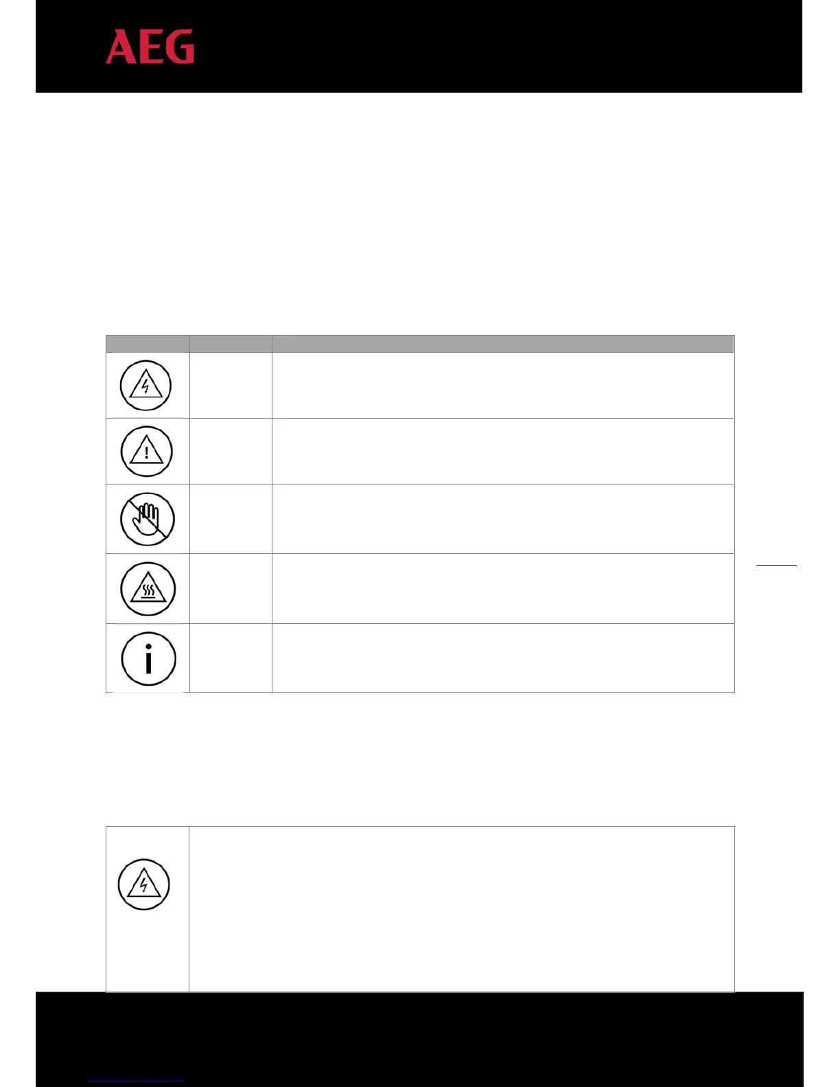 This section describes relevant warning symbols recurring in the installation and operation manual of AEG single-phase