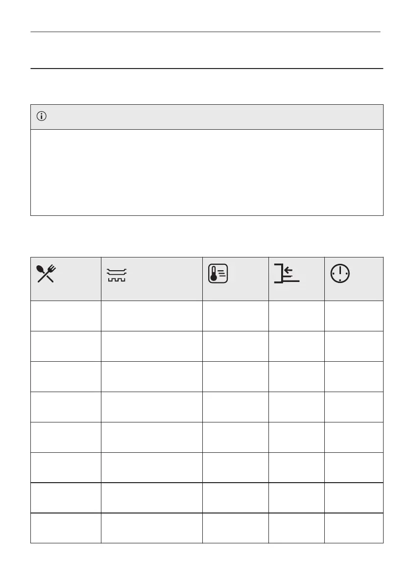 viser anbefalede indstillinger for temperatur, tilberedningstid og hyldeposition for specifikke typer