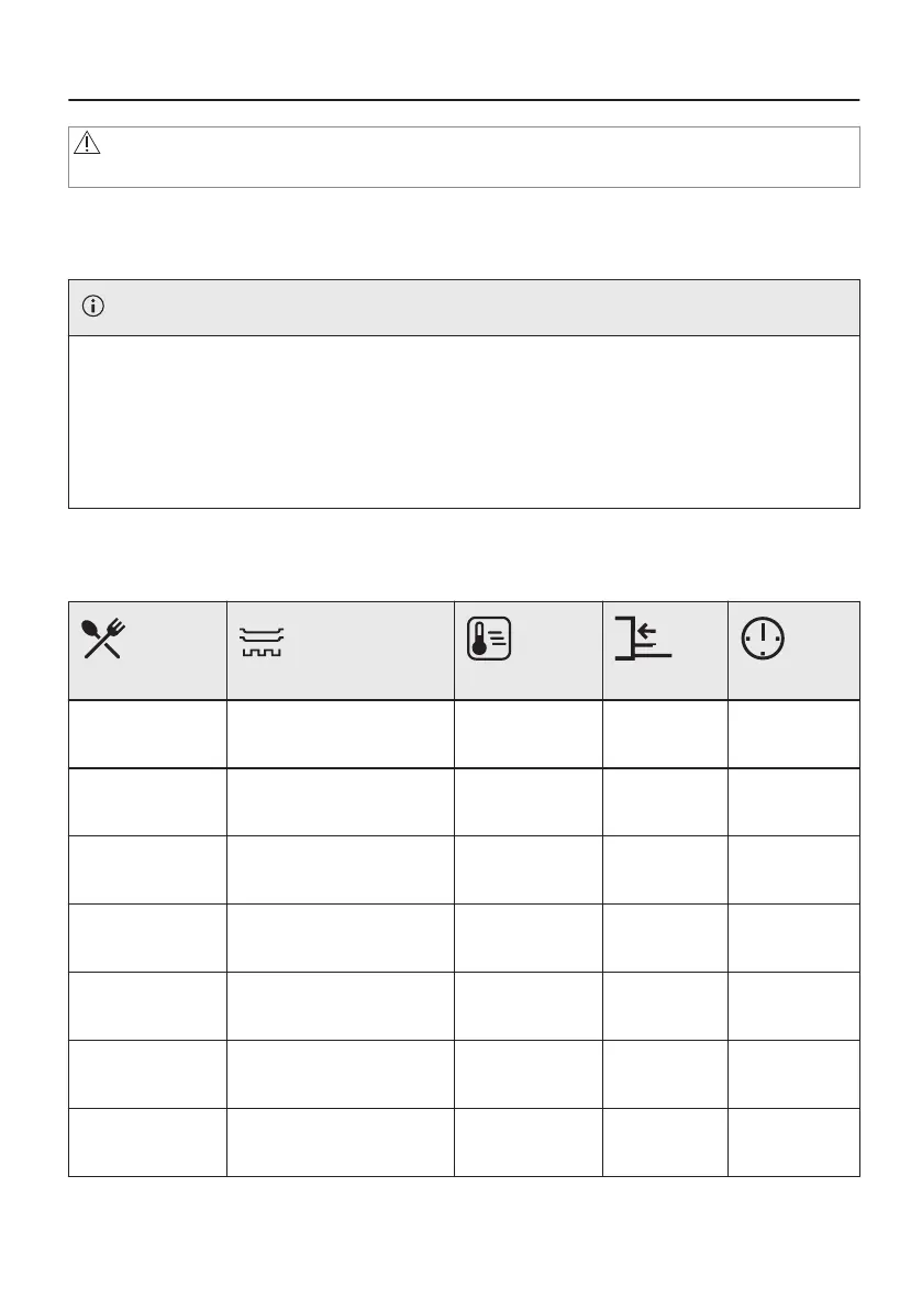The temperature and cooking times in the tables are guidelines only. They depend on the recipes