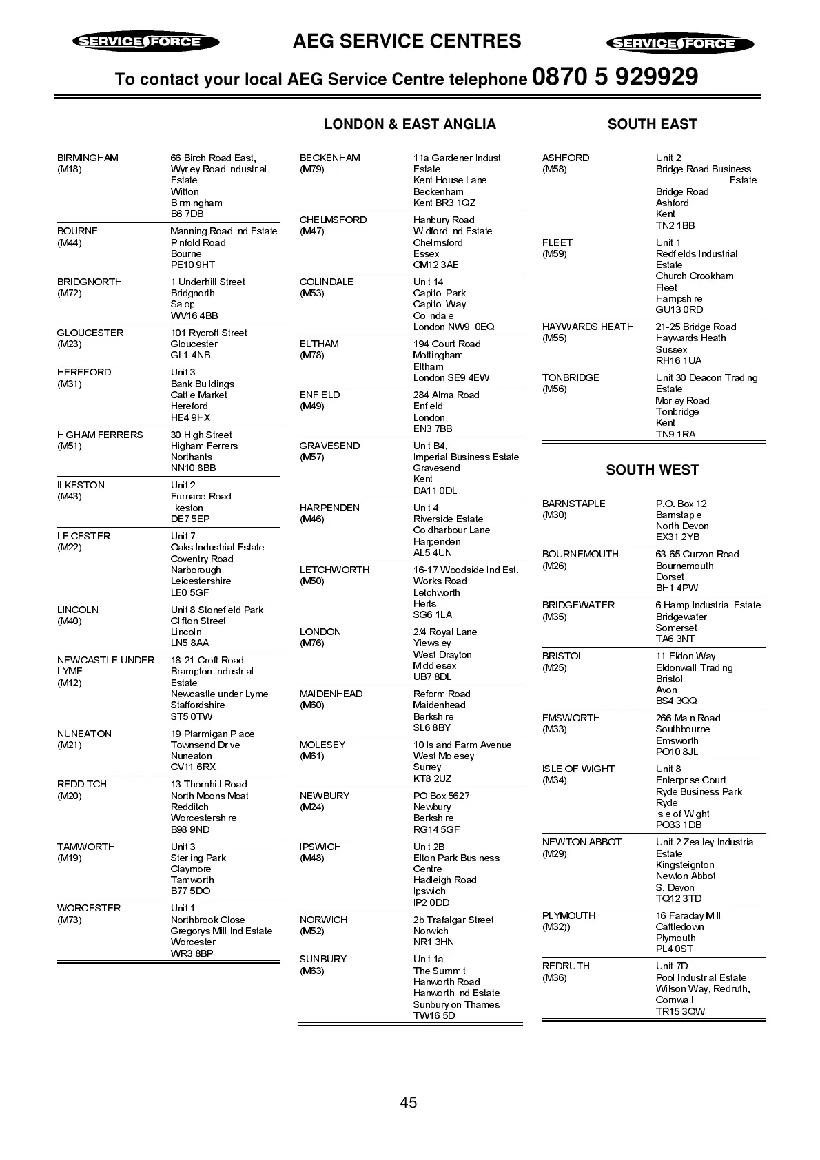 To contact your local AEG Service Centre telephone 0870 5 929929