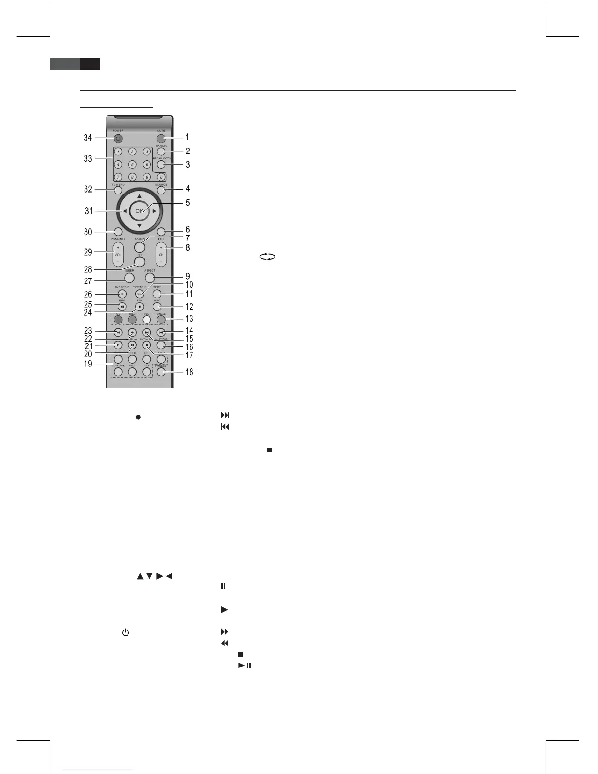 21 /RETURN: Wiedergabe starten (im USB Modus). Im DVD-Betrieb: Rückkehr ins