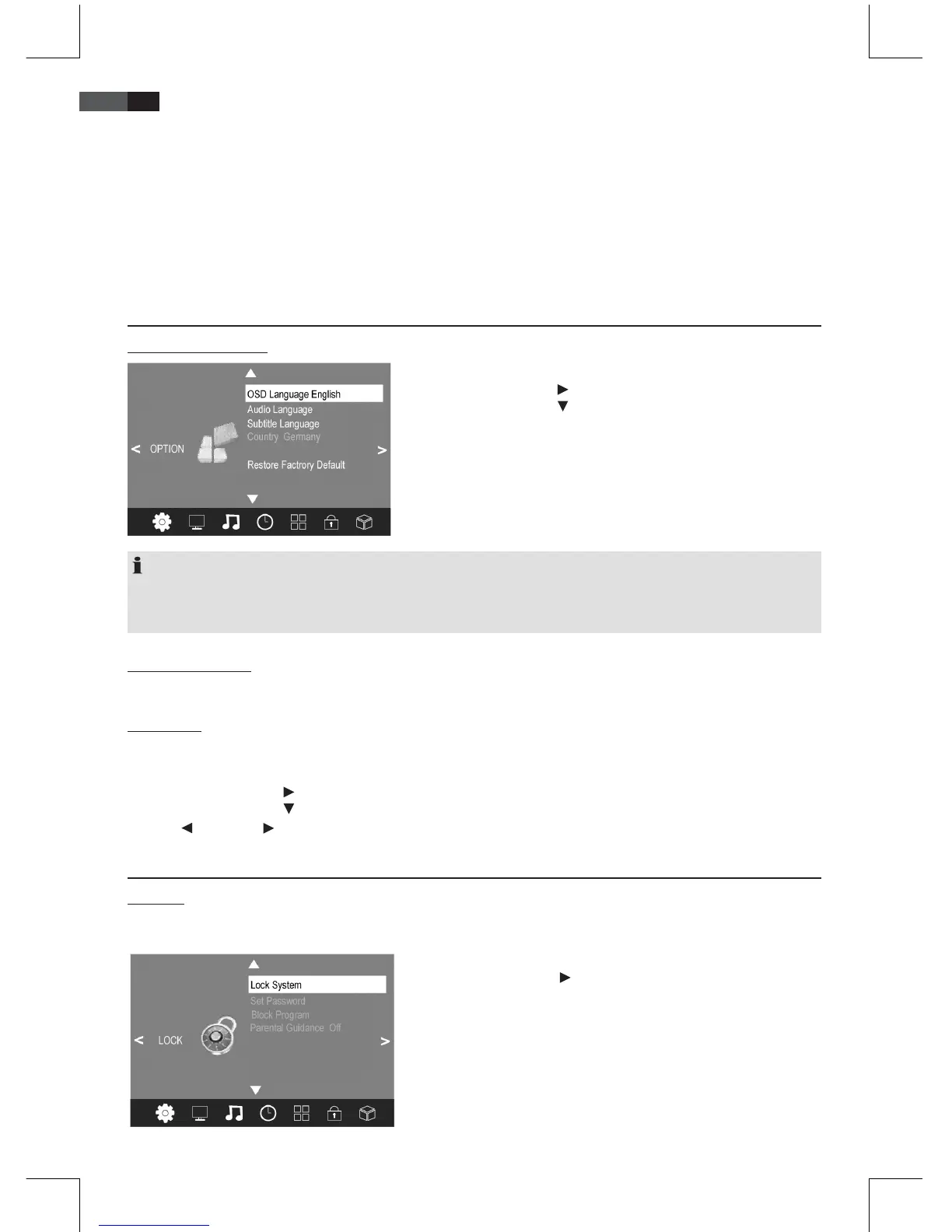 This menu allows you to set dierent locks and to change the Password. Enter the preset password 6666 to open the