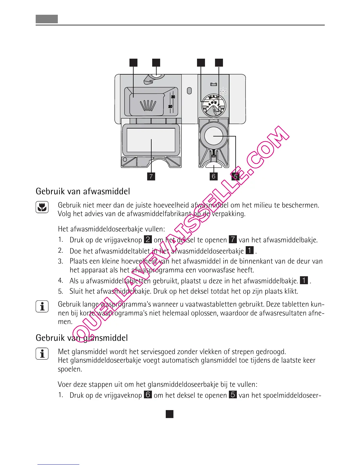 Het afwasmiddeldoseerbakje vullen:
