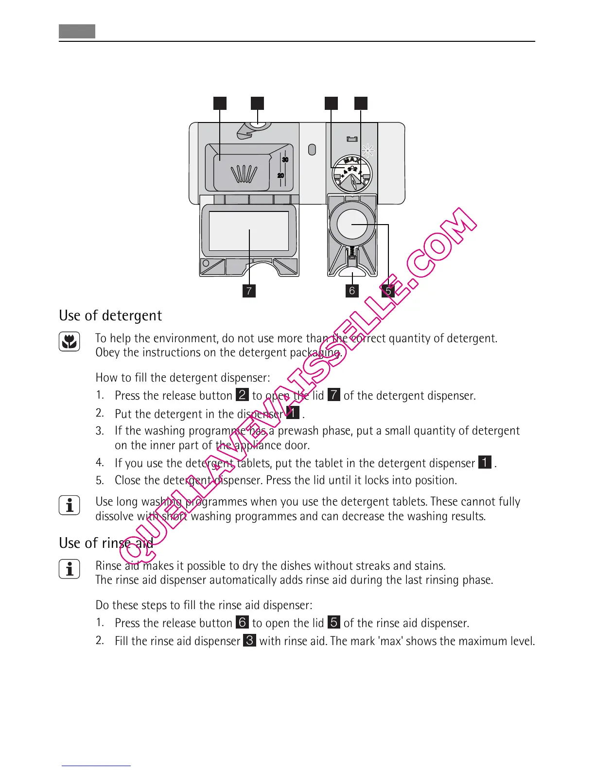with rinse aid. The mark 'max' shows the maximum level.
