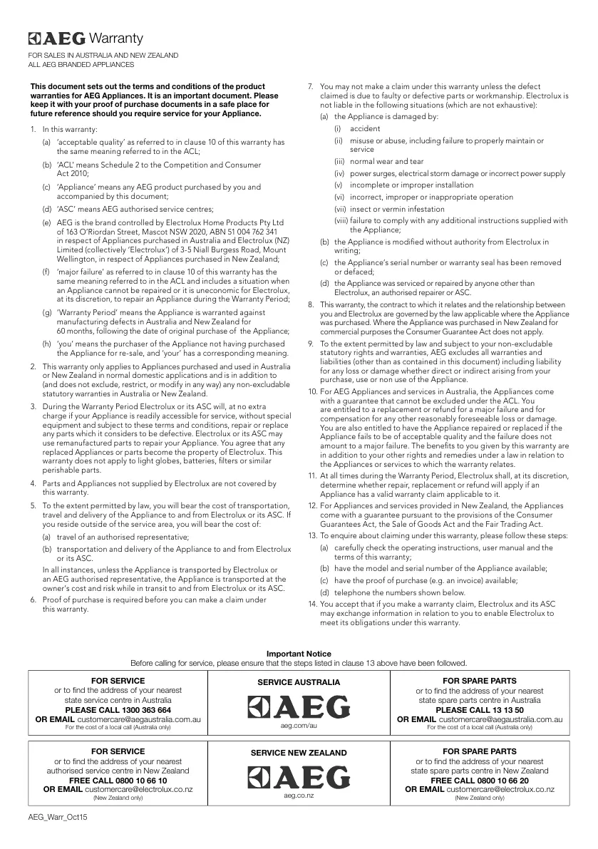14. You accept that if you make a warranty claim, Electrolux and its ASC