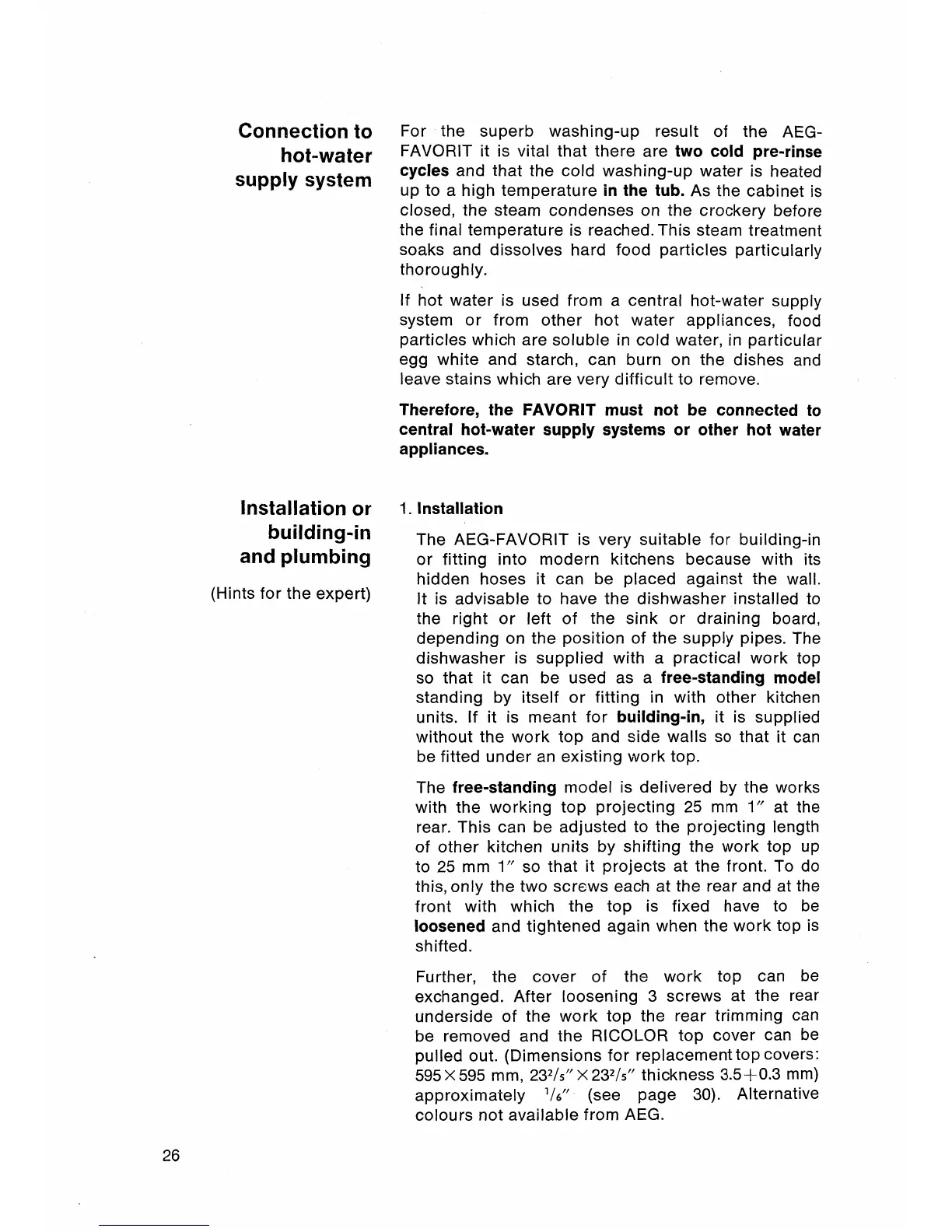 AEG FAVORIT - Advanced Installation and Plumbing; Hot Water Supply Warning; Built-in and Free-standing Setup