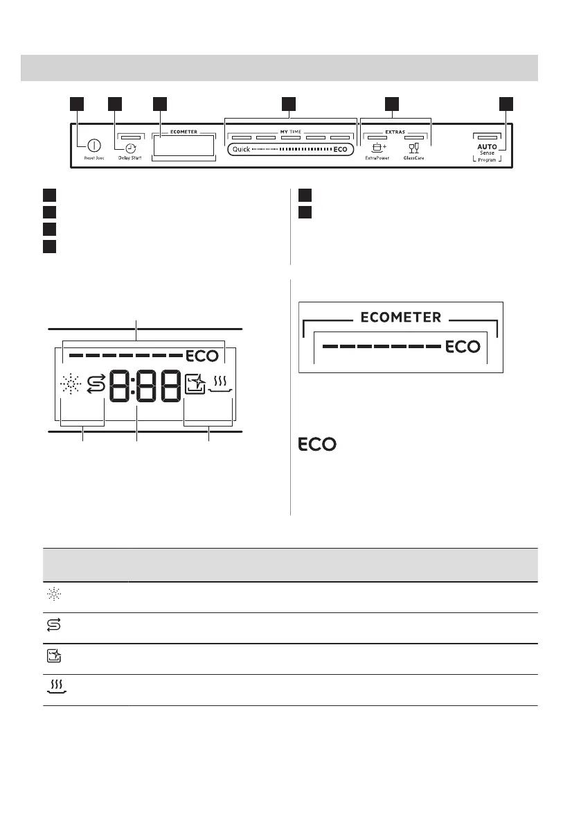Indicatielampje glansspoelmiddel. Dit is aan als het glansspoelmiddeldoseerbakje bijgevuld