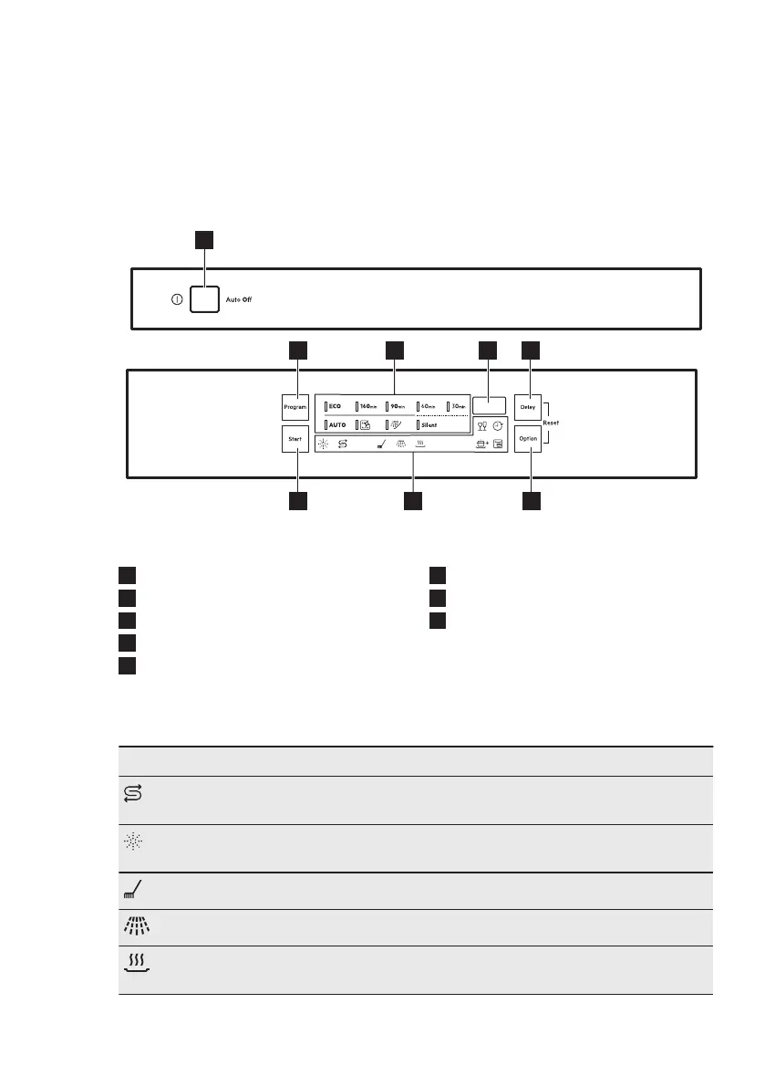 Drying phase indicator. It is on when you select a programme with the dry‐