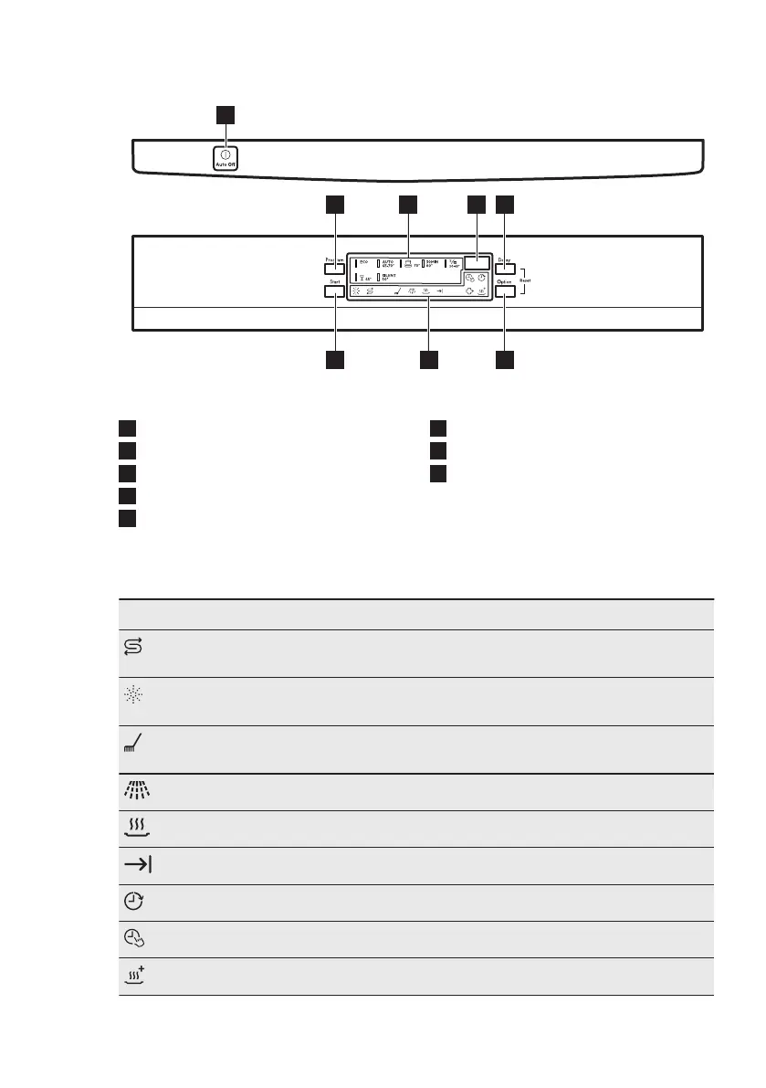 Rinse aid indicator. It is on when the rinse aid dispenser needs refilling. It