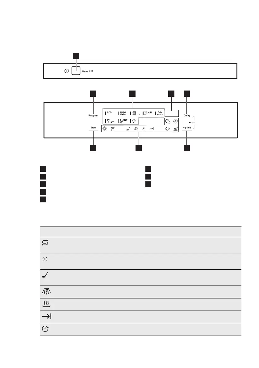 Rinse aid indicator. It is on when the rinse aid dispenser needs refilling. It