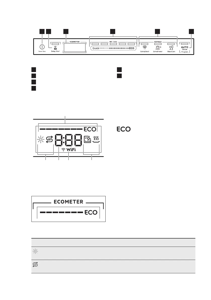 Klarspülmittelanzeige. Leuchtet, wenn der Klarspülmittel-Dosierer nachge‐