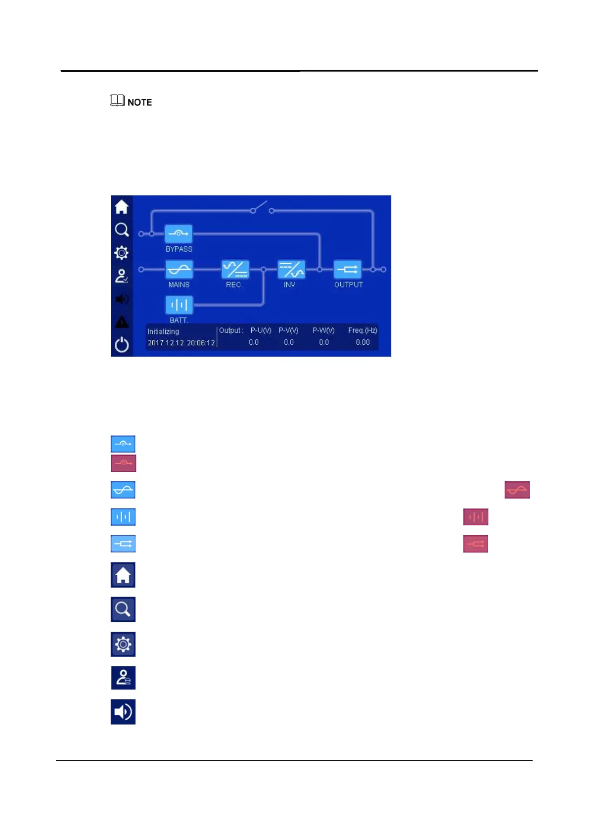 UPS adopt 7 inch touch screen to display, the page structure is the same. In this chapter, we take the