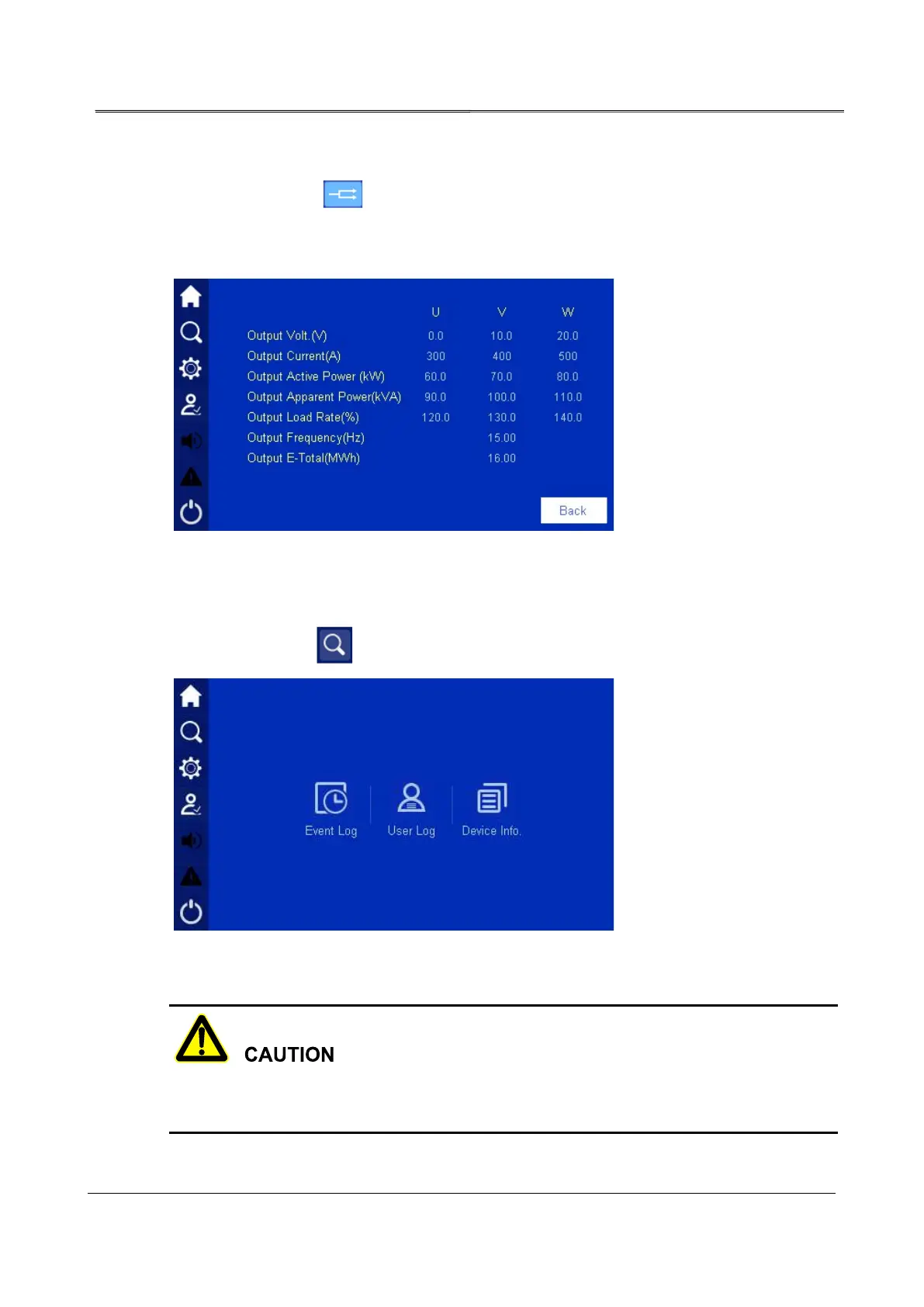Figure4-21. In the page, it shows the current three-phase output voltage, current, active power,