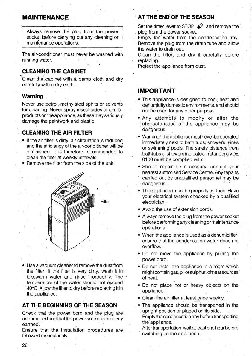 AEG K 19 E - Maintenance; Cleaning the Cabinet; Cleaning the Air Filter; Beginning of Season Checks