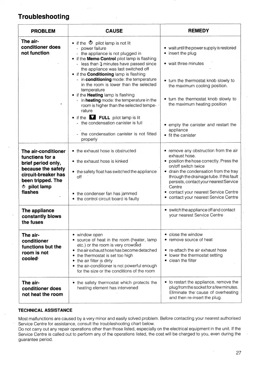 AEG K 19 E - Troubleshooting; Air-Conditioner Does Not Function; Brief Operation Due to Safety Tripping; Appliance Blows Fuses