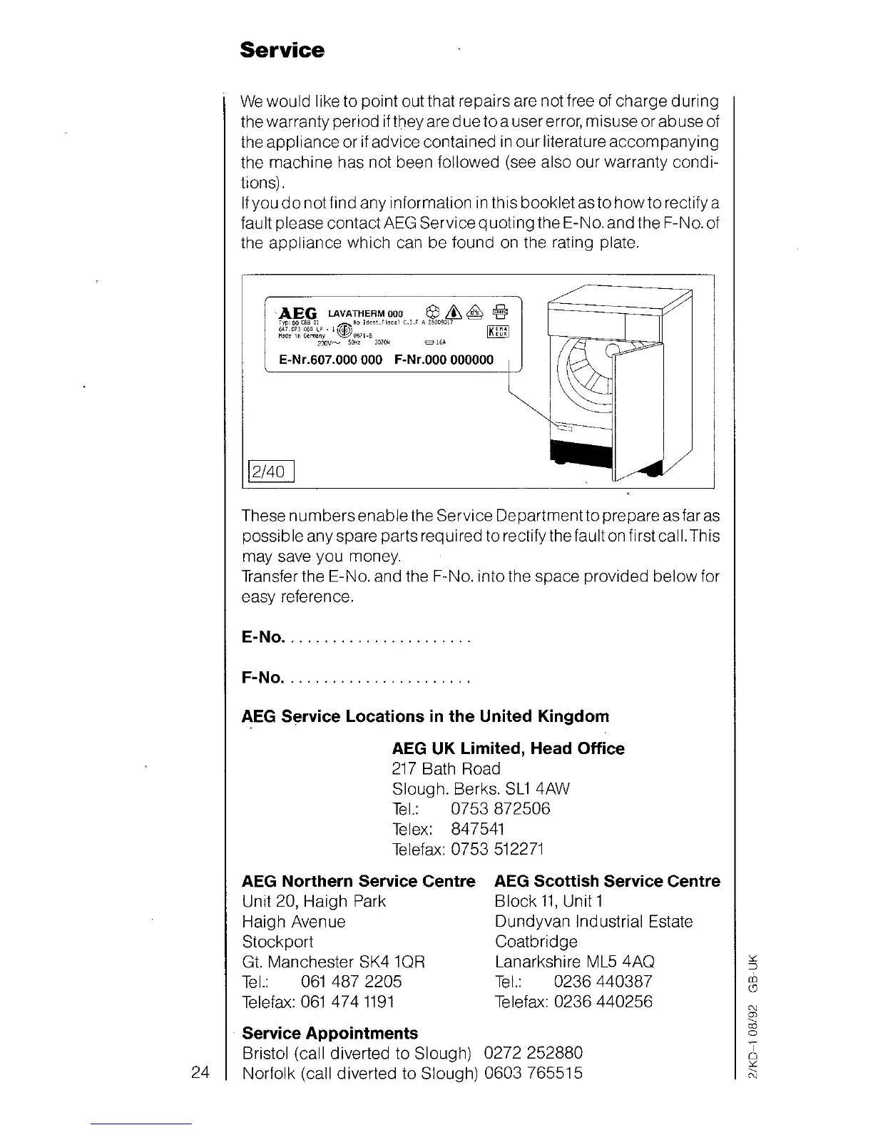 AEG Lavatherm 3400 microcomputer - Service and Support; UK Service Locations