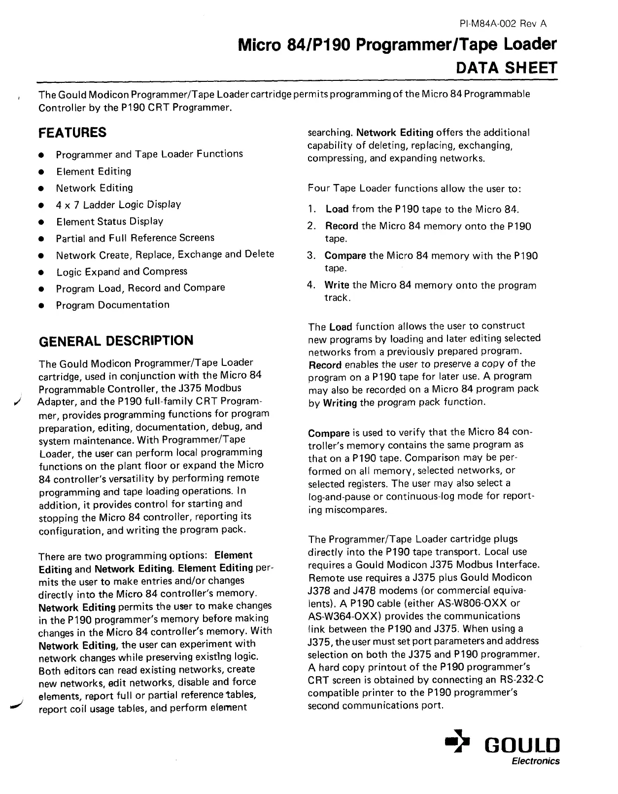 The Gould Modicon Programmer/Tape Loader cartridge permits programming of the Micro 84 Programmable