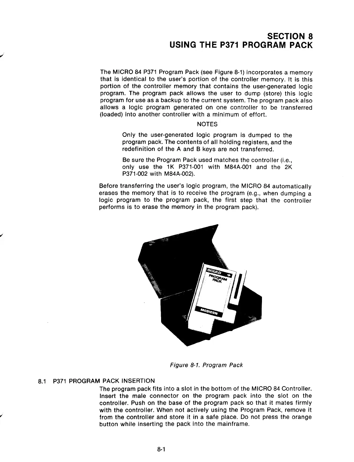 The MICRO 84 P371 Program Pack (see Figure 8-1) incorporates a memory