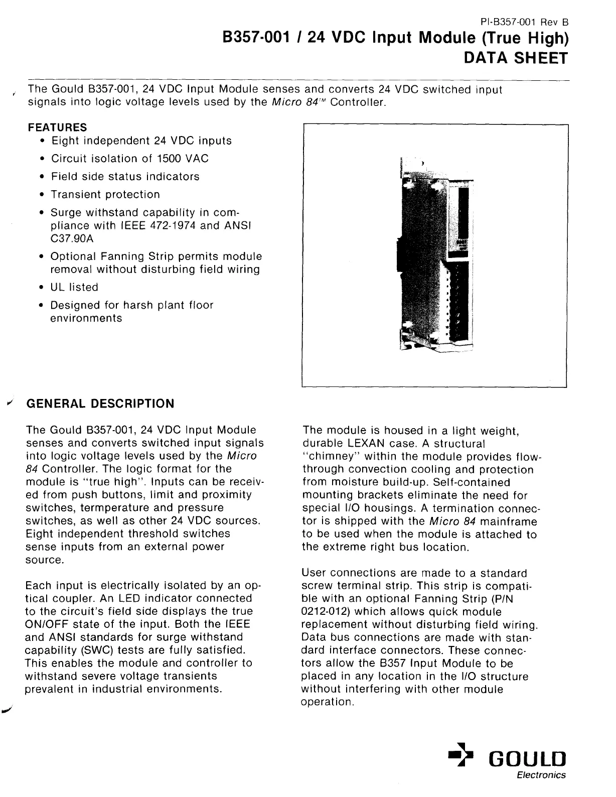 r The Gould B357-001, 24 VDC Input Module senses and converts 24 VDC switched input