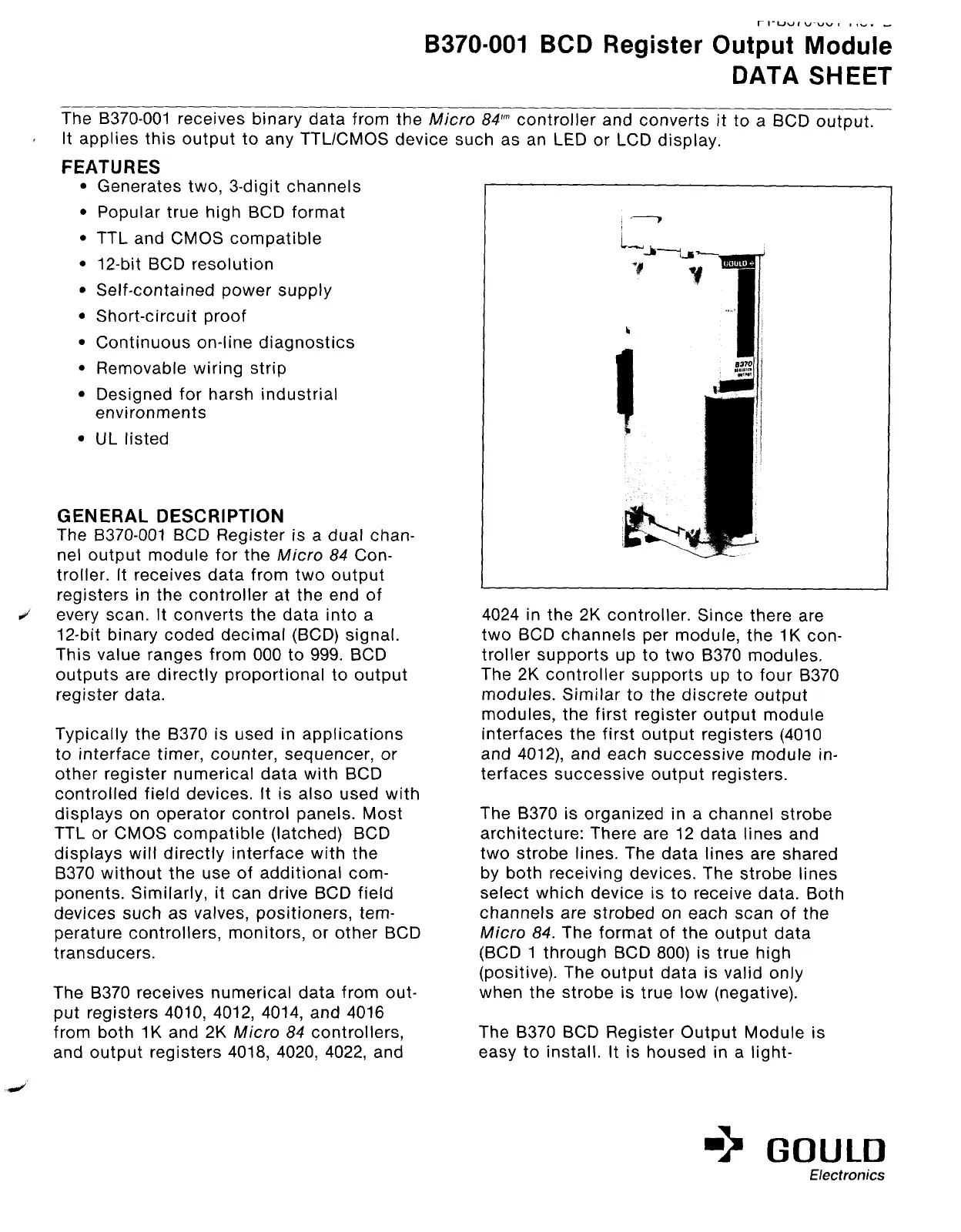The 8370-001 receives binary data from the Micro 84āā controller and converts it to a BCD output.