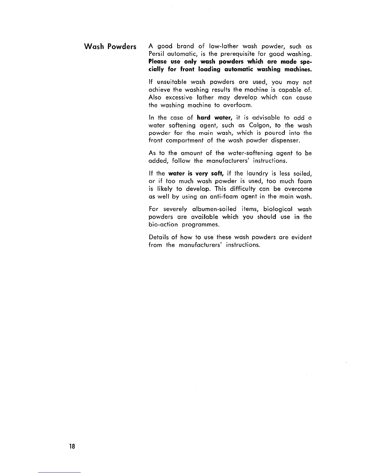 AEG PRINCESS S - Wash Powder Selection; Choosing Appropriate Detergents; Water Softeners and Anti-foam Agents