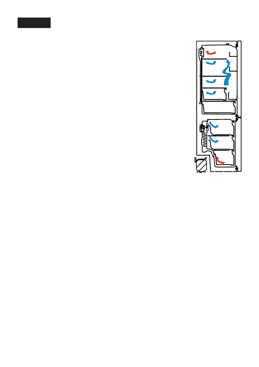 die durch den Lüfter oben im Kühlteil in das Gerät strömt, wird gekühlt,