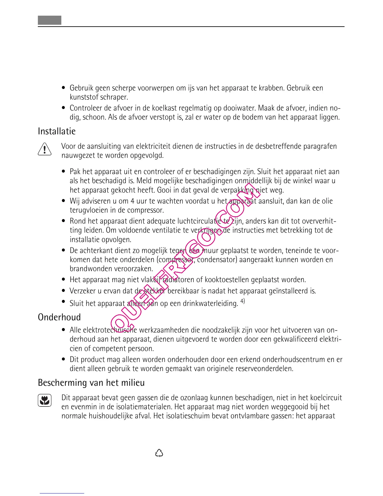 Dit apparaat bevat geen gassen die de ozonlaag kunnen beschadigen, niet in het koelcircuit