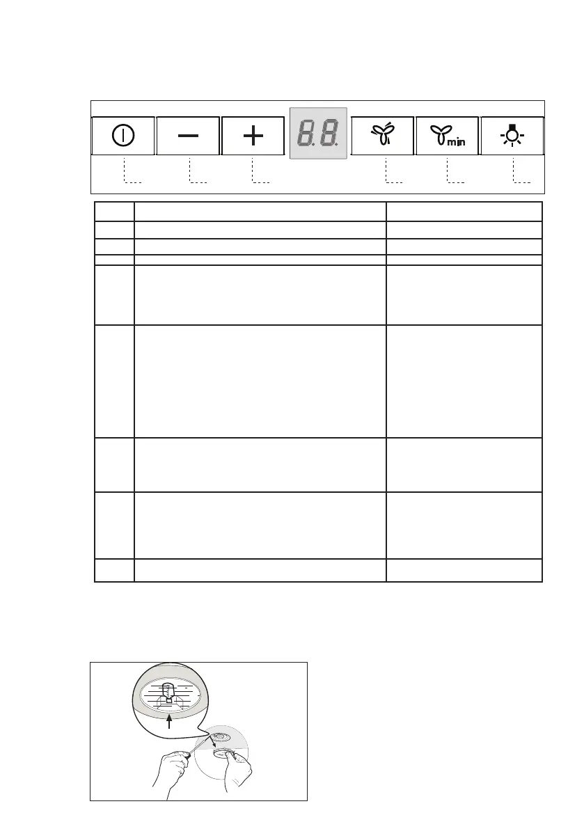 Укључује и искључује мотор аспиратора у првој брзини. Приказује подешену брзину