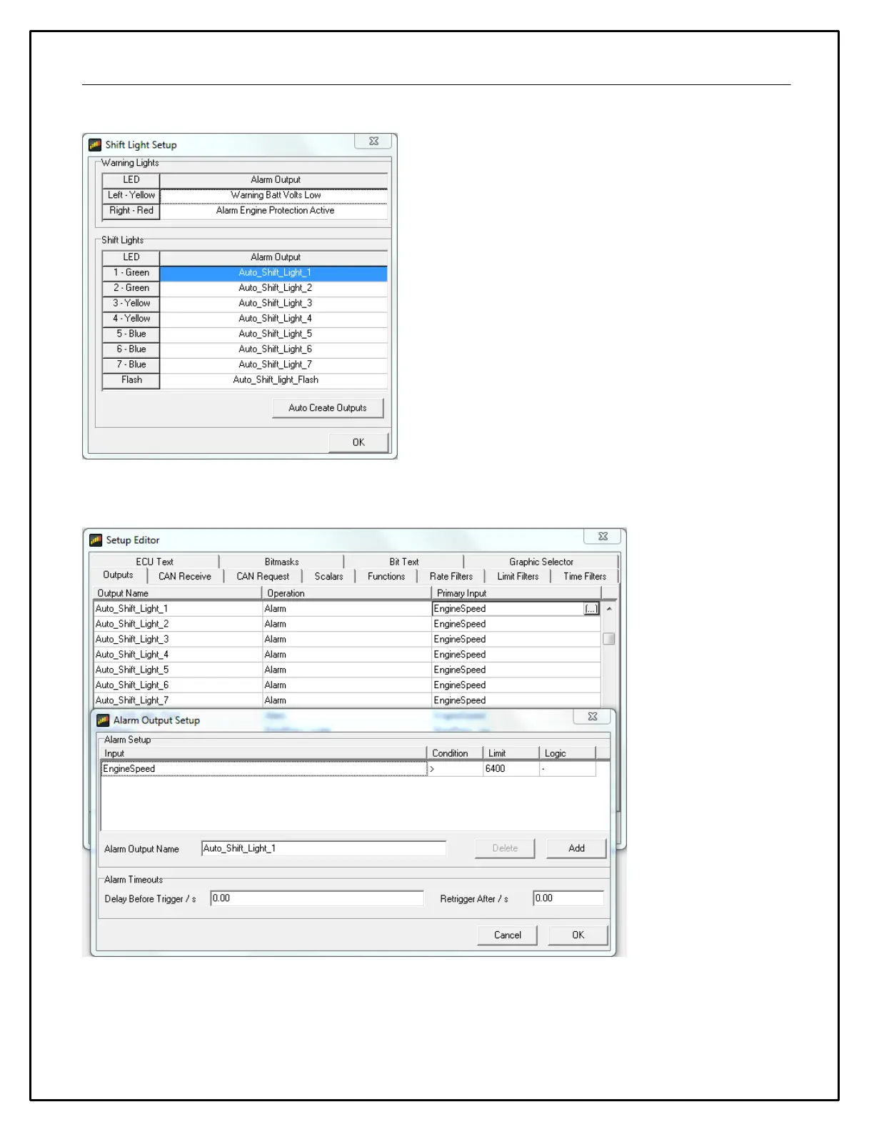 The LED and shift light setup will be pre-configured with AEM supplied setup files. The Alarm outputs used to trigger