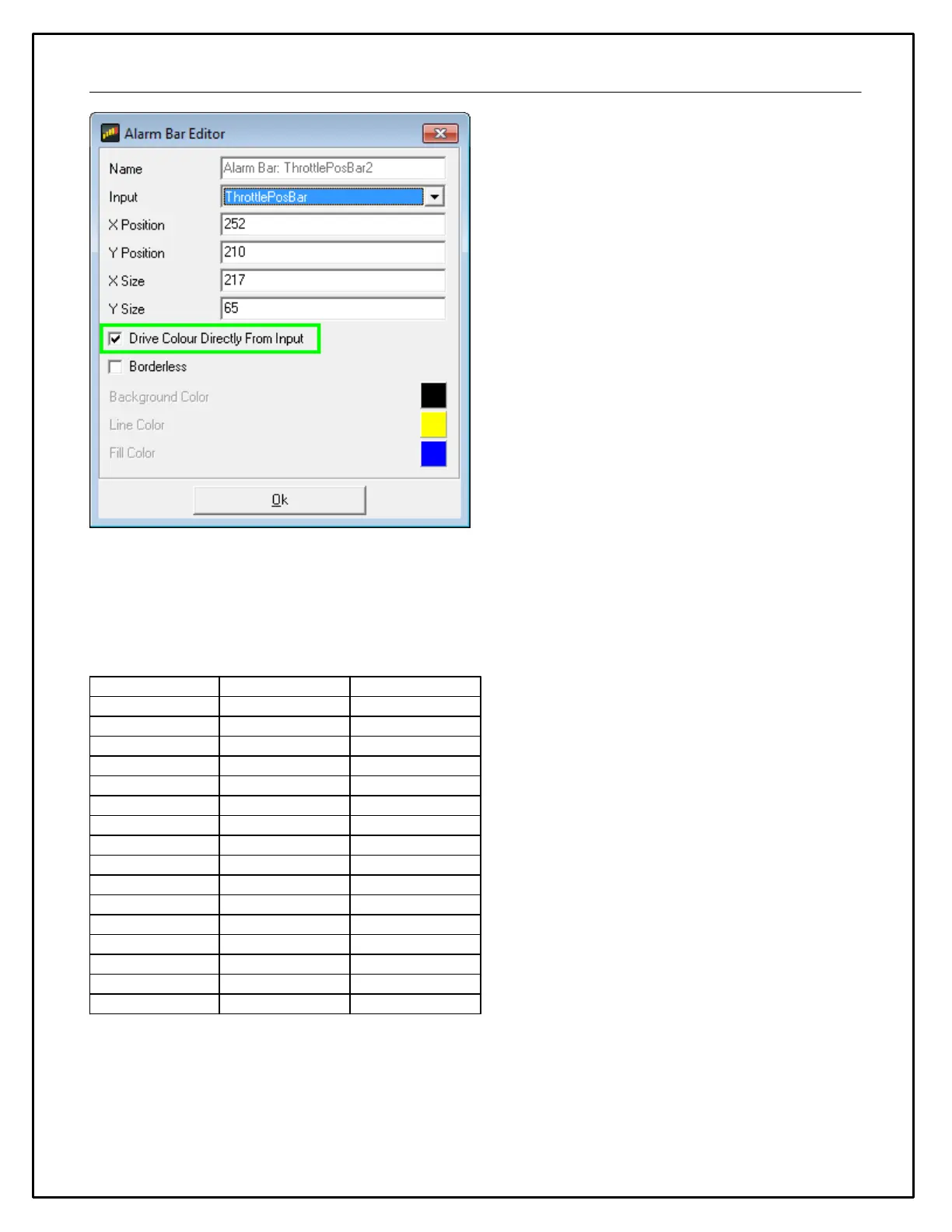 Set the input to the appropriate channel and check Drive Color Directly From Input. All other Alarm Bar functions