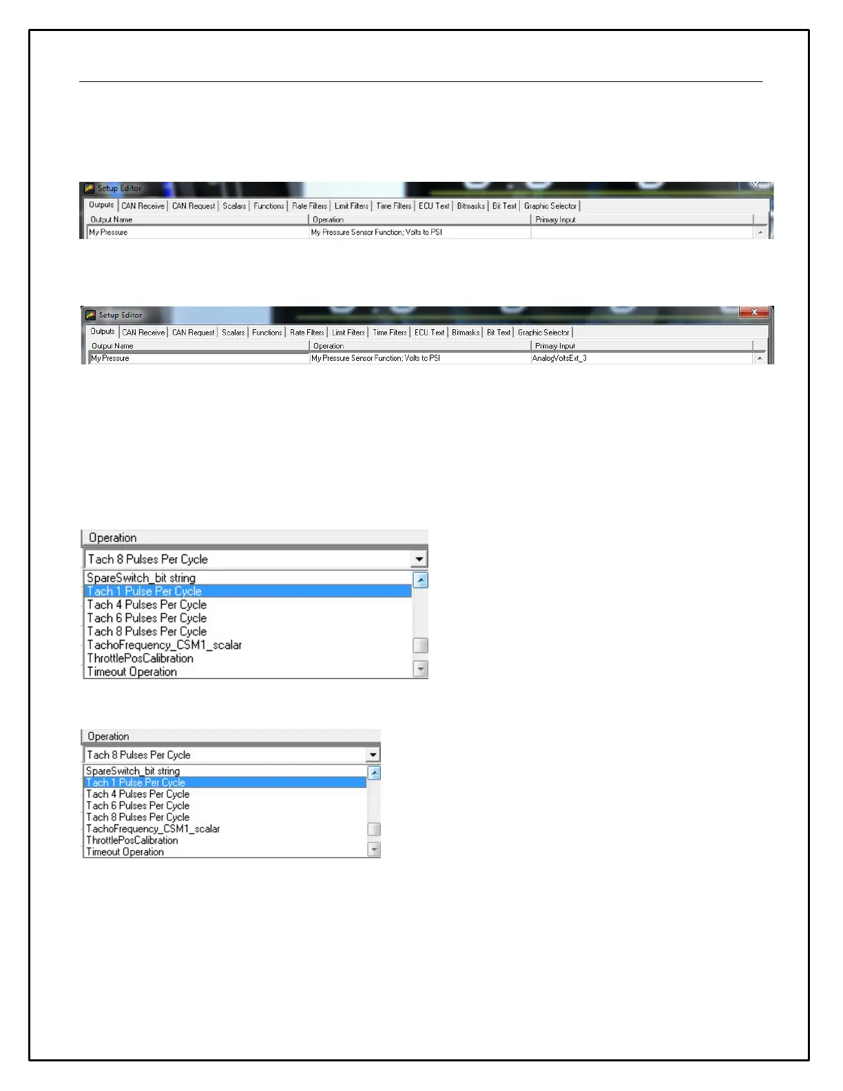 input. Find the EngineSpeed output in the Setup Editor. In the example below you can see it uses a scalar for 8