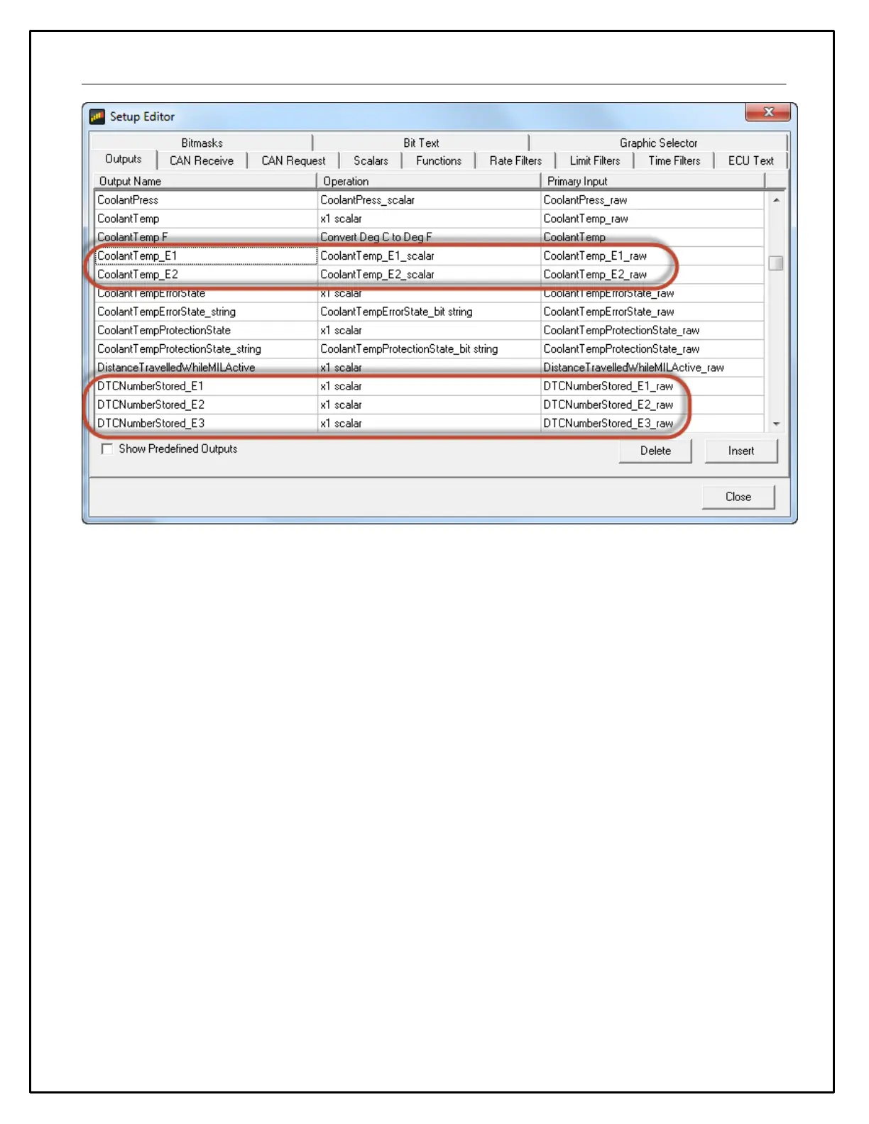 Open the Setup Editor. OBDII PIDs will be automatically added to your list of available outputs. The circled