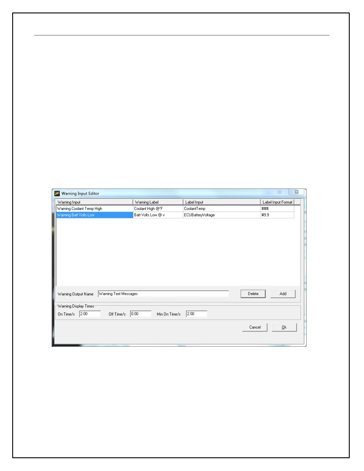 The example above shows two existing Warning Inputs. These were both previously defined as Alarm outputs