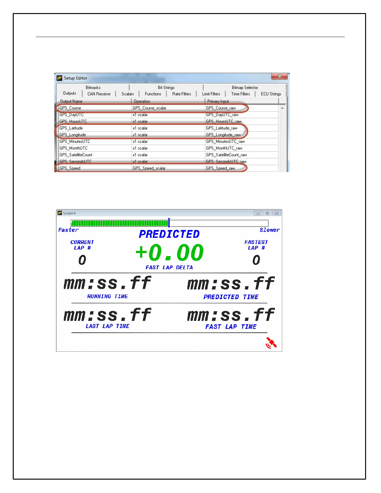 Most AEM default setups include a lap timing screen. The VDM for GPS speed and lap timing section