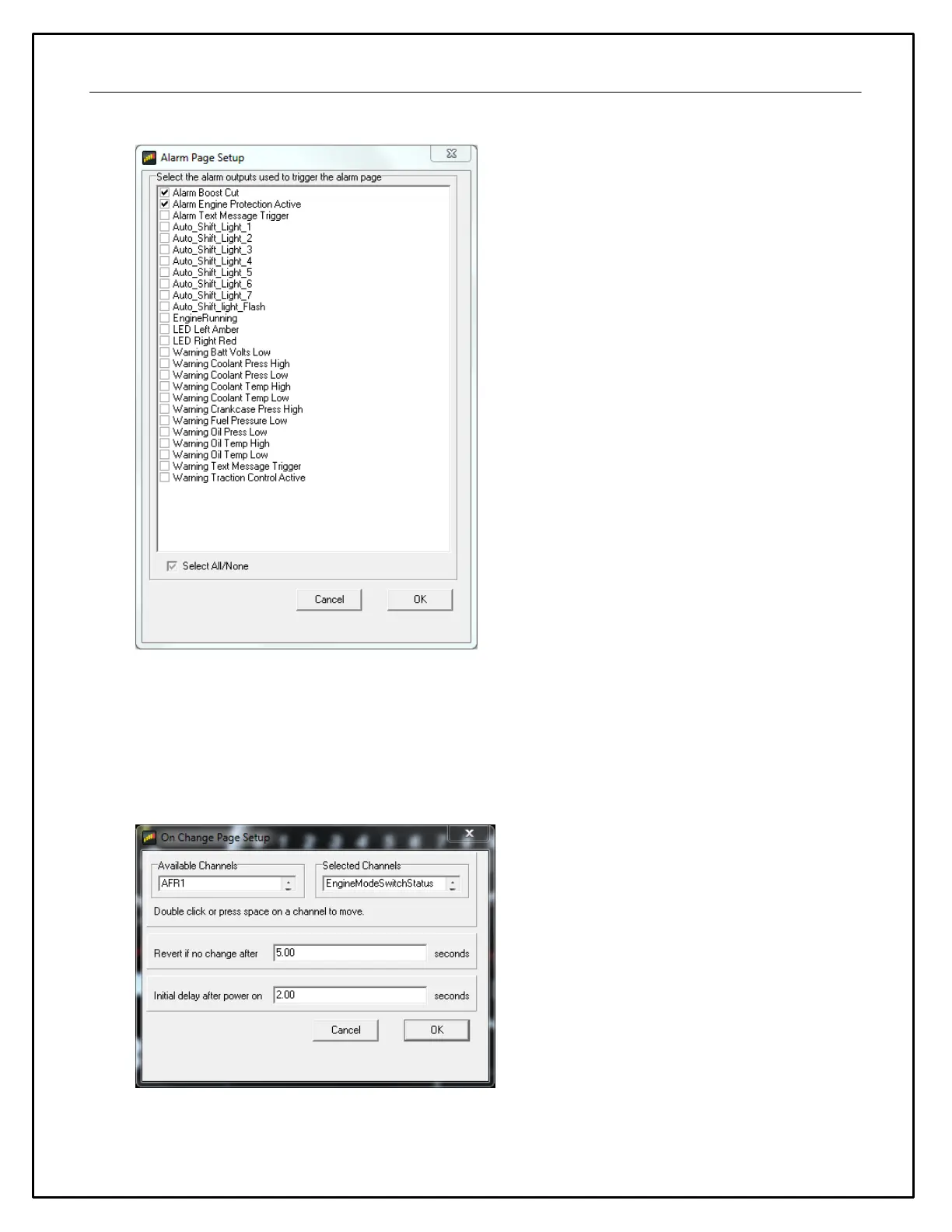 AEM setups will come pre-configured with many optional Alarm outputs. Choose the ones you want to trigger