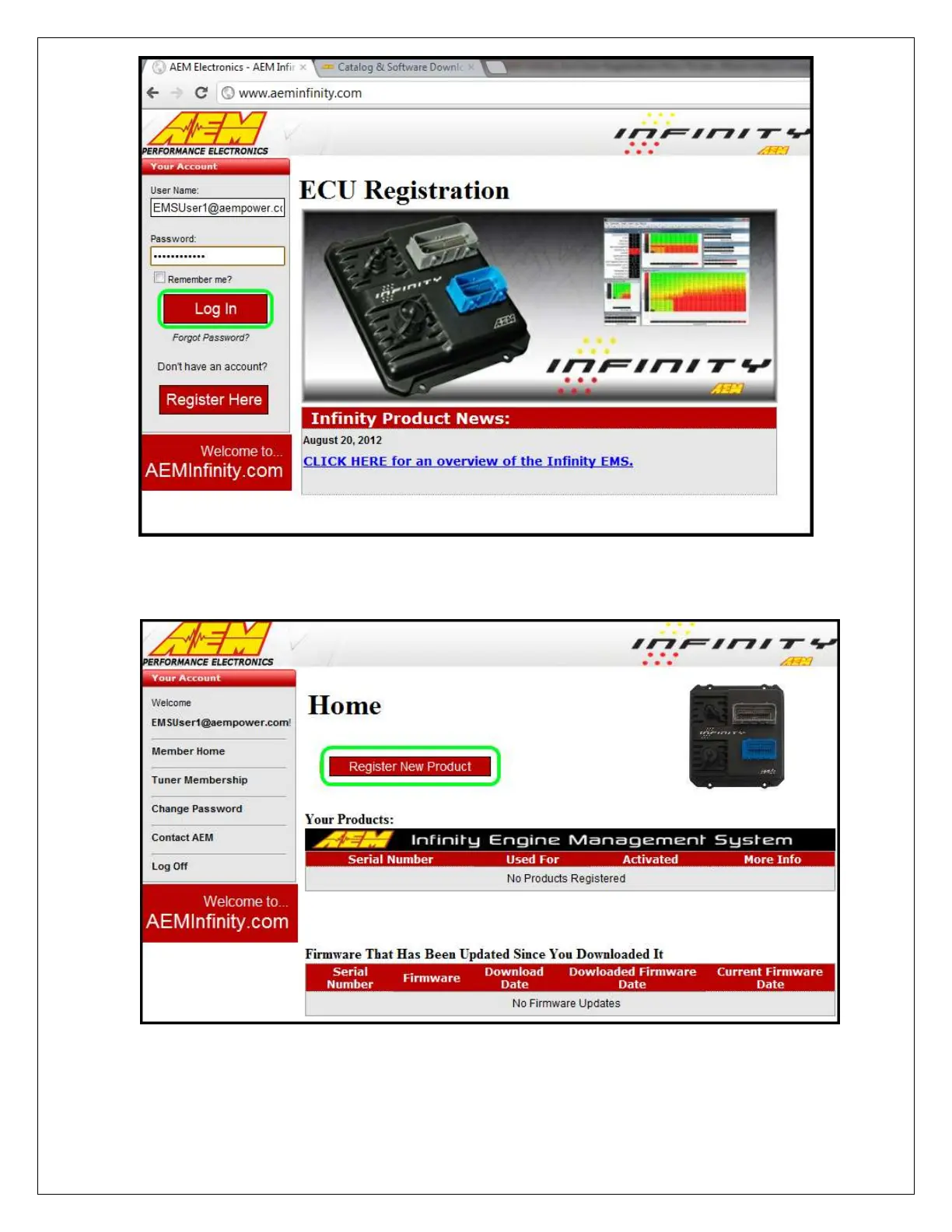 AEM INFINITY ECU - Infinity ECU Product Registration; Initiating Product Registration; Entering Serial and Security Codes