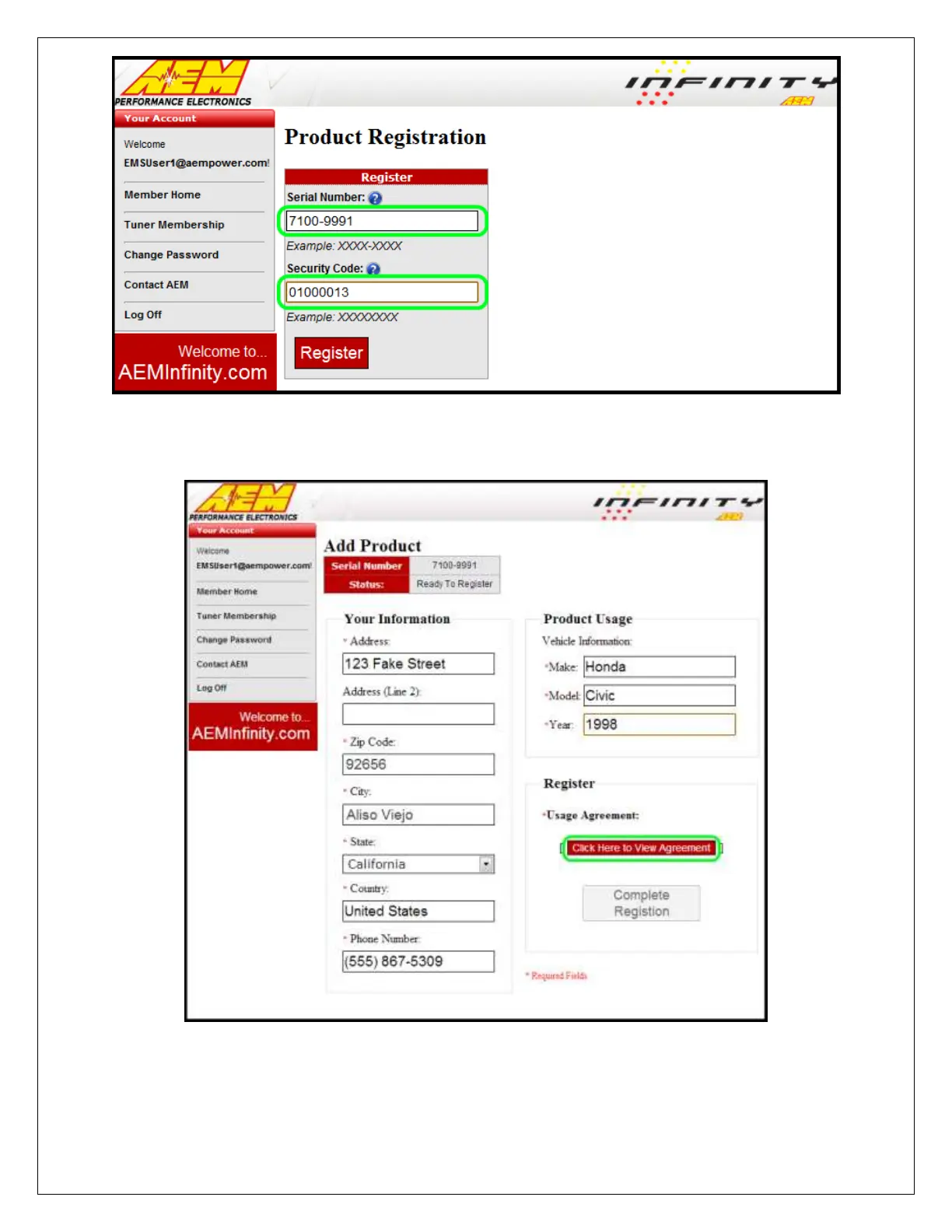 AEM INFINITY ECU - Product Registration Details; Entering User and Vehicle Information