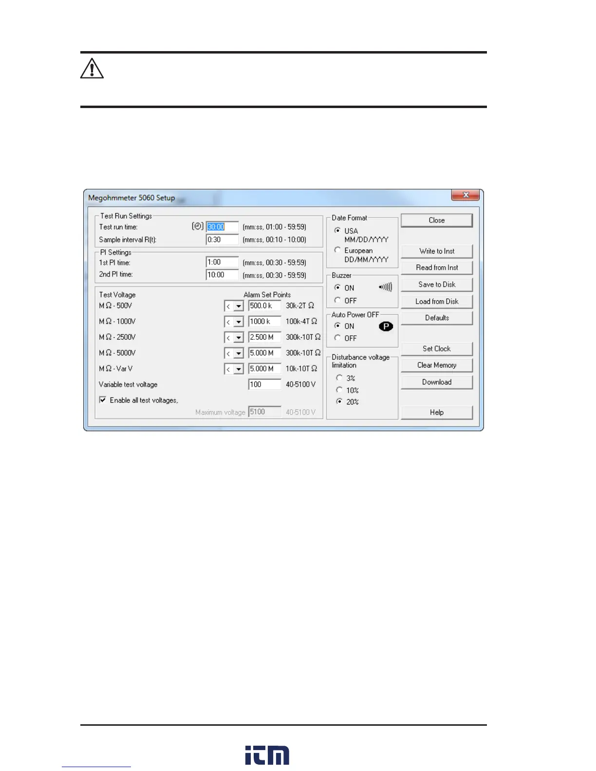 ThisdialogboxletsyoucongureeveryaspectoftheModel5060megohmmeter.