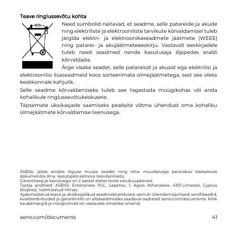 kvaliteedinõuded ja garantiiinfo on allalaadimiseks saadaval aadressil aeno.com/documents. Kõik
