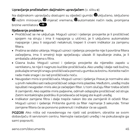 • Pročišćivač se ne uključuje. Mogući uzroci i rješenje: provjerite je li pročišćivač